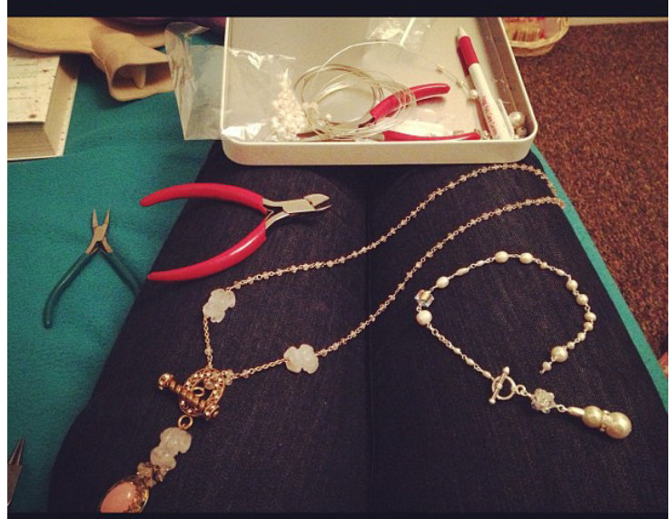 “My business is mostly based in my bedroom. No matter what part of the world I am in, you’ll see me hunched over my tools, my legs crossed, squinting away, as I am near sighted. Quality, beauty, delicacy and intricate work inspire the bits and stones I use as supplies. Overtime, I have evolved from using beads and coloured wire to Swarovski crystals, fresh water pearls, precious/semi precious stones, silver, gold plated and pure gold wire and balls.