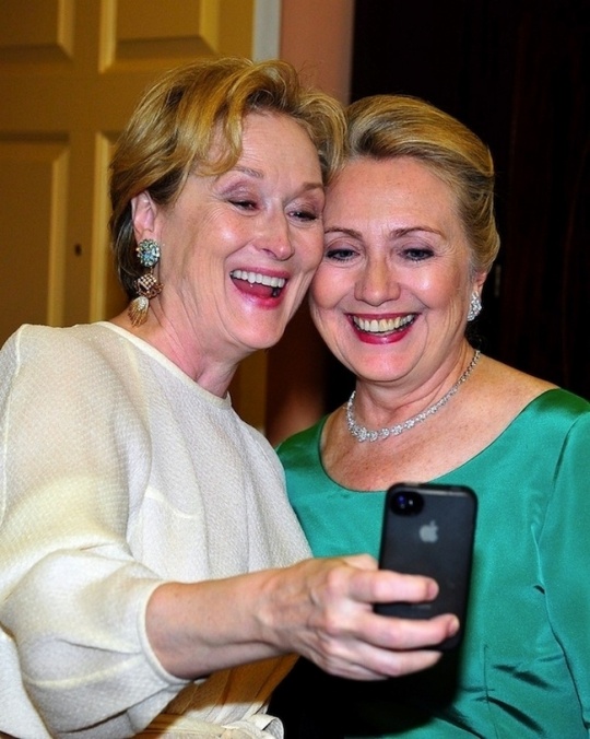 Meryl Streep and Hillary Clinton bring out the little girls in them by posing for a selfie on Meryl’s iPhone.