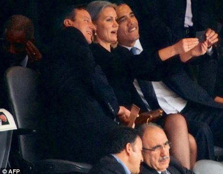 Power Selfie; David Cameron (L), Helle Thorning-Schmidt (M) and Barrack Obama (R) pose for a selfie at the Mandela Memorial service, which generated a lot of media frenzy.