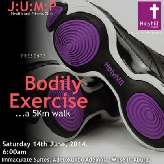 So if you live in the city of Abuja, join me for our next J.U.M.P 5K at City Park Wuse 2 on the 16th of August 2014 by 7am prompt. A 5km bodily exercise that members of HOLYHILL church come together to participate in. You are allowed to come with your friends and family too.